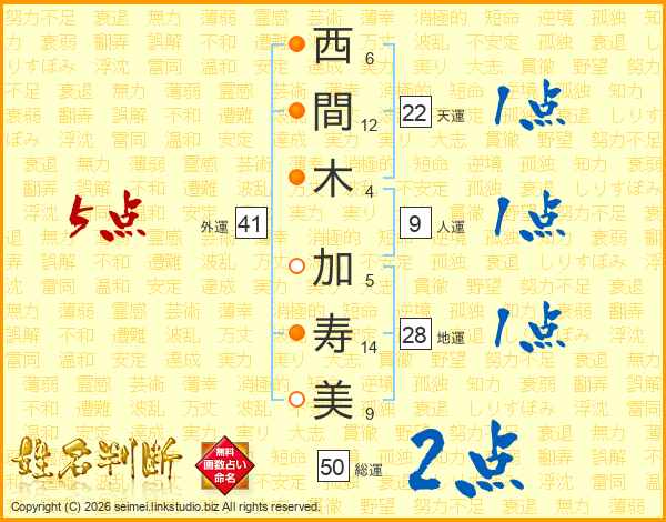 西(6画)間(12画)木(4画) 加(5画)寿(14画)美(9画)