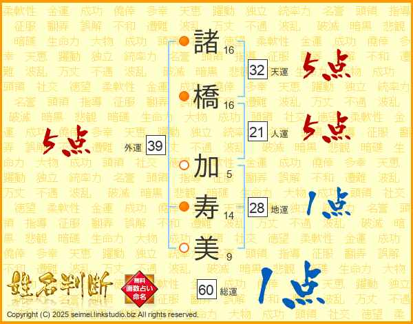 諸(16画)橋(16画) 加(5画)寿(14画)美(9画)