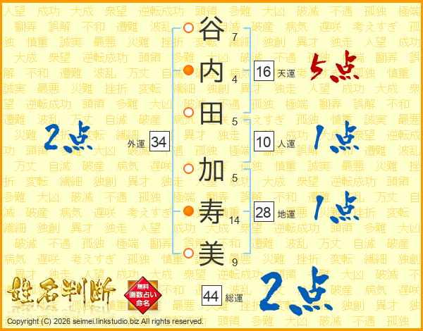 谷(7画)内(4画)田(5画) 加(5画)寿(14画)美(9画)