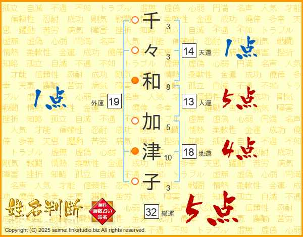 千(3画)々(3画)和(8画) 加(5画)津(10画)子(3画)