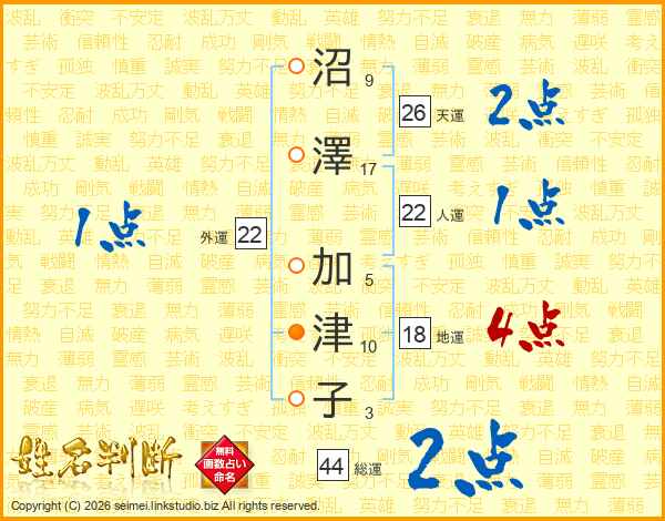 沼(9画)澤(17画) 加(5画)津(10画)子(3画)