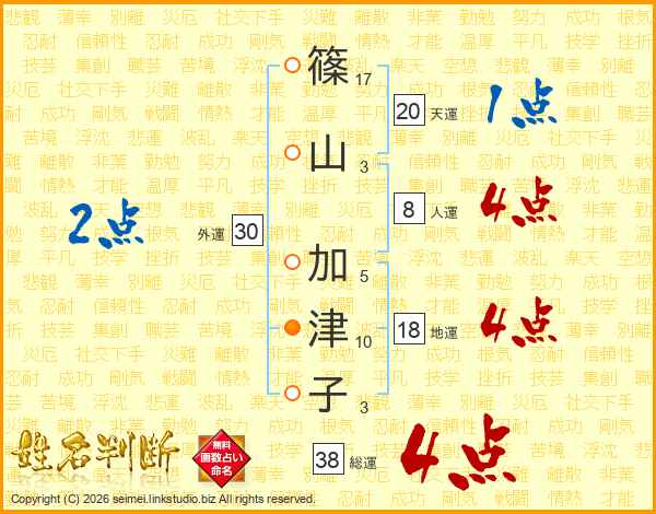 篠(17画)山(3画) 加(5画)津(10画)子(3画)