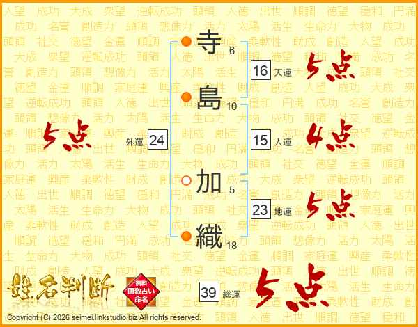 寺(6画)島(10画) 加(5画)織(18画)