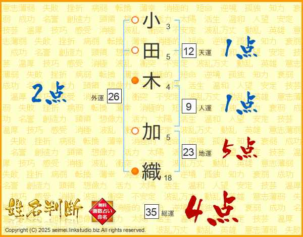小(3画)田(5画)木(4画) 加(5画)織(18画)