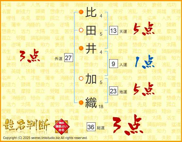 比(4画)田(5画)井(4画) 加(5画)織(18画)
