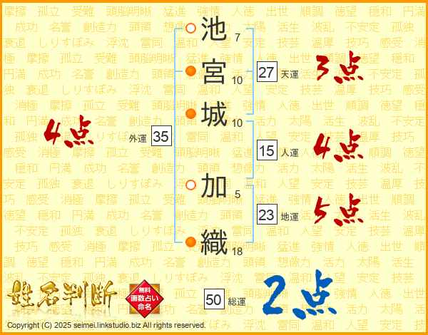 池(7画)宮(10画)城(10画) 加(5画)織(18画)