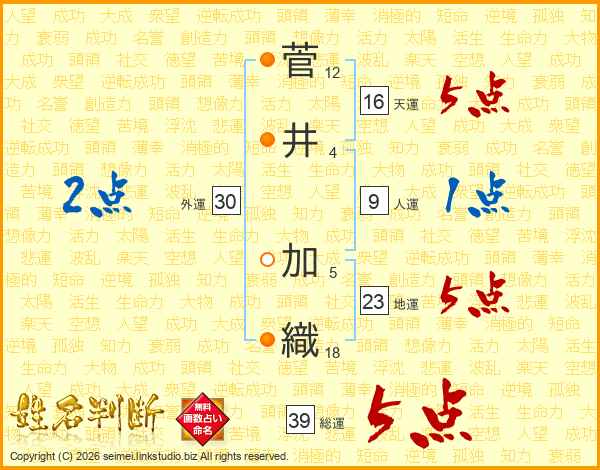 あなたの人生を表す1番重要な運勢です。生涯を通じて影響する総合運となり、主に50歳以降の晩年期に影響を及ぼします。苗字と名前の合計画数。