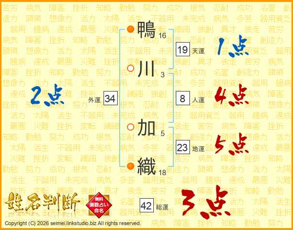 生活面を象徴する運勢です。外部から受ける影響力を表し、結婚運、家庭運や職場、環境への順応性を表します。総運から人運を引いた画数。姓や名が1文字の場合を除く。