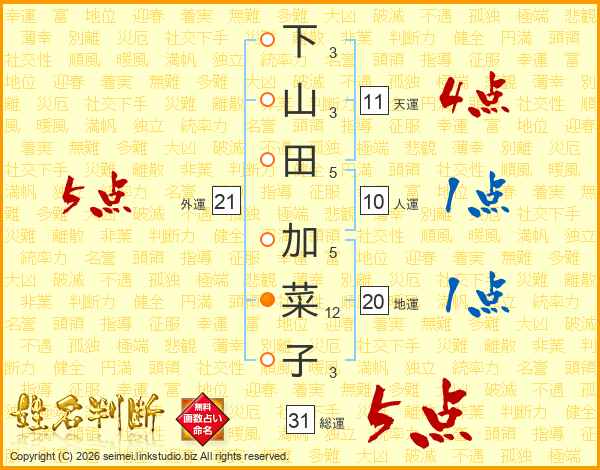 下(3画)山(3画)田(5画) 加(5画)菜(12画)子(3画)