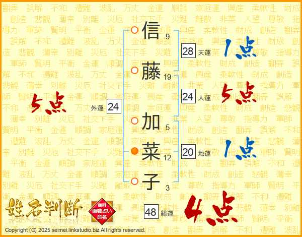 信(9画)藤(19画) 加(5画)菜(12画)子(3画)