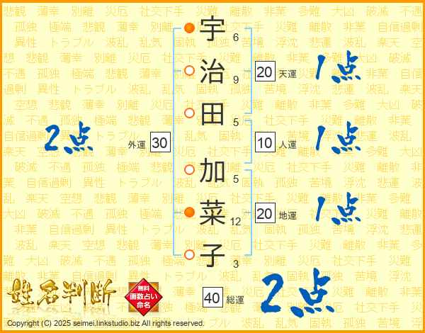 宇(6画)治(9画)田(5画) 加(5画)菜(12画)子(3画)