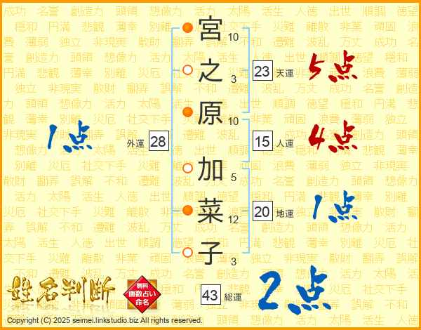宮(10画)之(3画)原(10画) 加(5画)菜(12画)子(3画)
