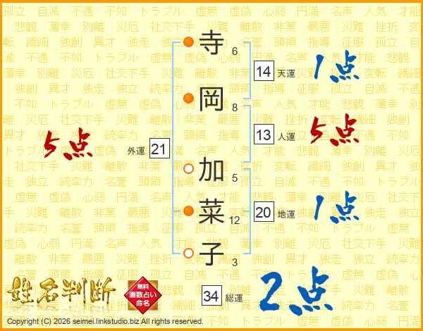 寺(6画)岡(8画) 加(5画)菜(12画)子(3画)