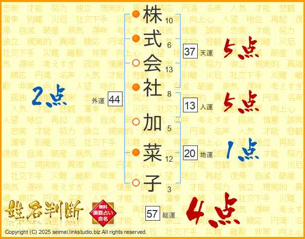 株(10画)式(6画)会(13画)社(8画) 加(5画)菜(12画)子(3画)