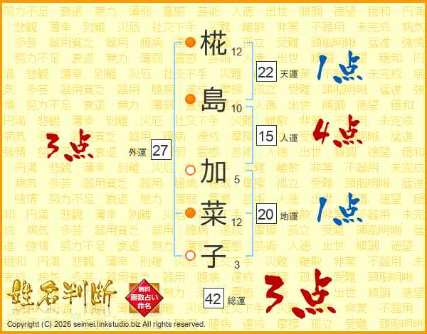 椛(12画)島(10画) 加(5画)菜(12画)子(3画)