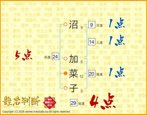 沼(9画) 加(5画)菜(12画)子(3画)