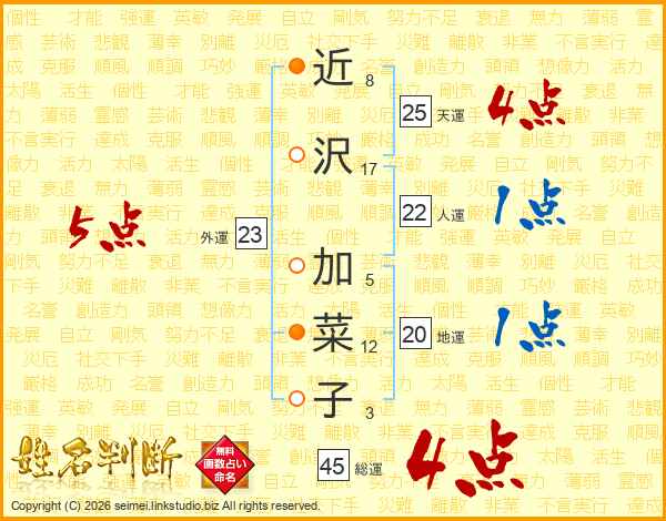 近(8画)沢(17画) 加(5画)菜(12画)子(3画)