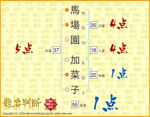 馬(10画)場(12画)園(13画) 加(5画)菜(12画)子(3画)