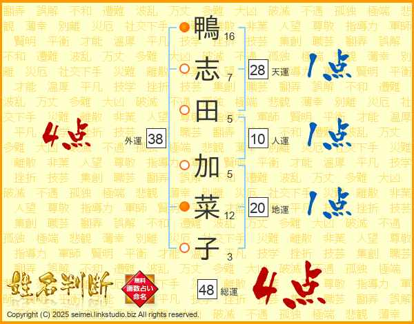 鴨(16画)志(7画)田(5画) 加(5画)菜(12画)子(3画)