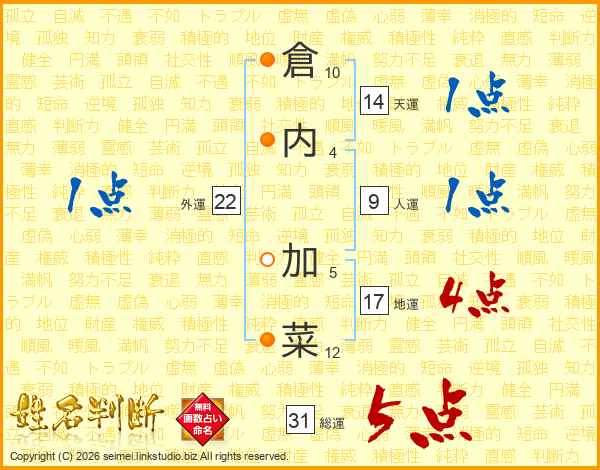 生活面を象徴する運勢です。外部から受ける影響力を表し、結婚運、家庭運や職場、環境への順応性を表します。総運から人運を引いた画数。姓や名が1文字の場合を除く。