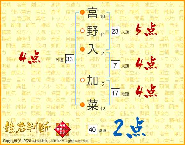 宮(10画)野(11画)入(2画) 加(5画)菜(12画)