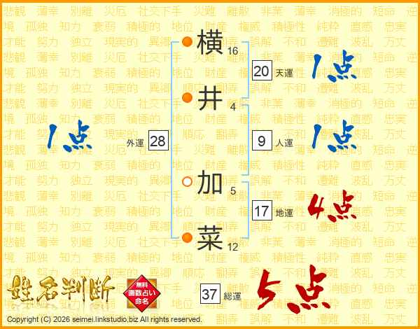 生活面を象徴する運勢です。外部から受ける影響力を表し、結婚運、家庭運や職場、環境への順応性を表します。総運から人運を引いた画数。姓や名が1文字の場合を除く。