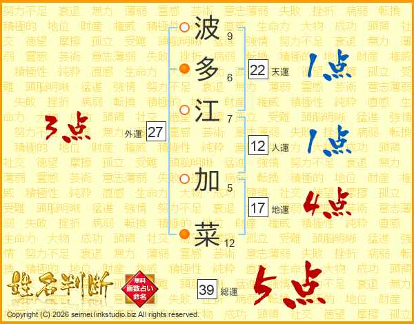 波多江加菜さんの総運は39画の5点!