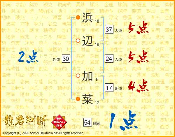 浜(18画)辺(19画) 加(5画)菜(12画)