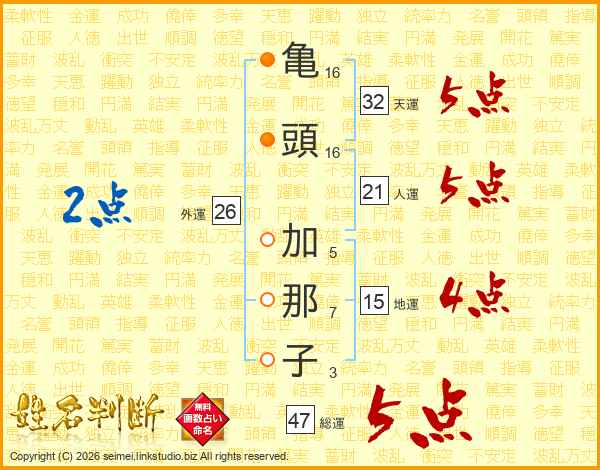亀(16画)頭(16画) 加(5画)那(7画)子(3画)