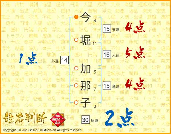 今(4画)堀(11画) 加(5画)那(7画)子(3画)