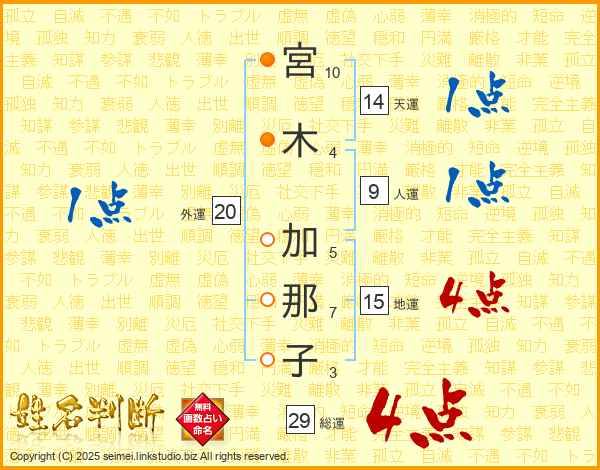 宮(10画)木(4画) 加(5画)那(7画)子(3画)