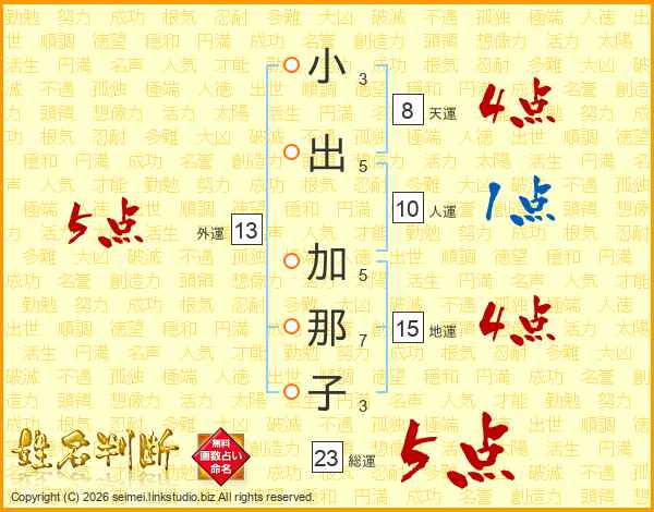 小(3画)出(5画) 加(5画)那(7画)子(3画)