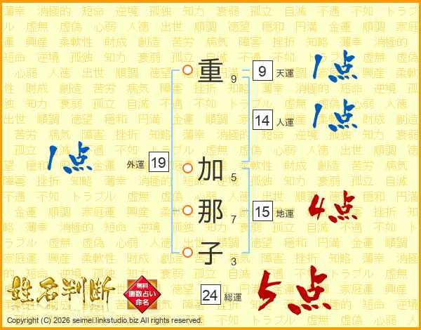 生活面を象徴する運勢です。外部から受ける影響力を表し、結婚運、家庭運や職場、環境への順応性を表します。総運から人運を引いた画数。姓や名が1文字の場合を除く。