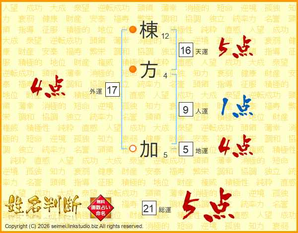 生活面を象徴する運勢です。外部から受ける影響力を表し、結婚運、家庭運や職場、環境への順応性を表します。総運から人運を引いた画数。姓や名が1文字の場合を除く。