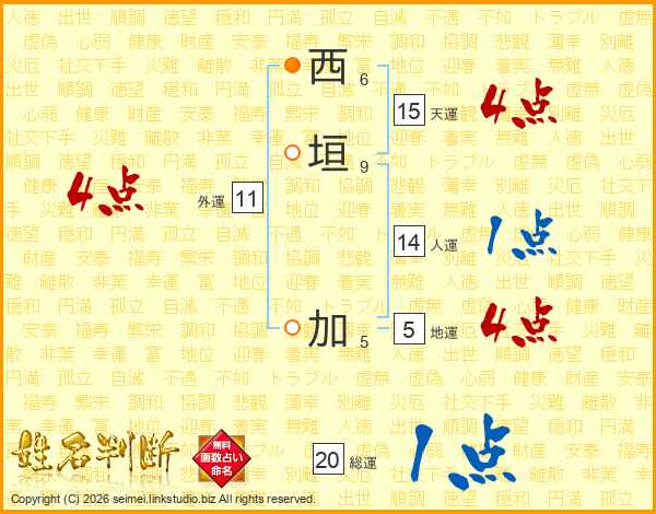 生活面を象徴する運勢です。外部から受ける影響力を表し、結婚運、家庭運や職場、環境への順応性を表します。総運から人運を引いた画数。姓や名が1文字の場合を除く。
