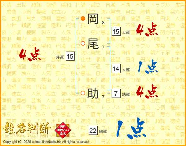 岡尾助さんの総運は22画の1点!