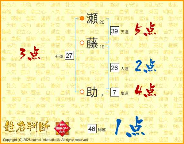 瀬藤助さんの総運は46画の1点!