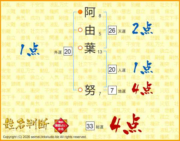 阿由葉努さんの総運は33画の4点!