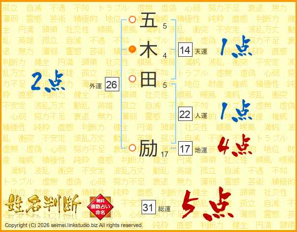 生活面を象徴する運勢です。外部から受ける影響力を表し、結婚運、家庭運や職場、環境への順応性を表します。総運から人運を引いた画数。姓や名が1文字の場合を除く。
