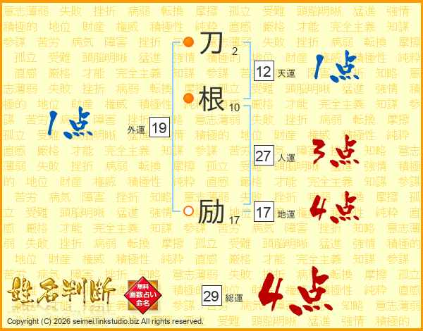 生活面を象徴する運勢です。外部から受ける影響力を表し、結婚運、家庭運や職場、環境への順応性を表します。総運から人運を引いた画数。姓や名が1文字の場合を除く。
