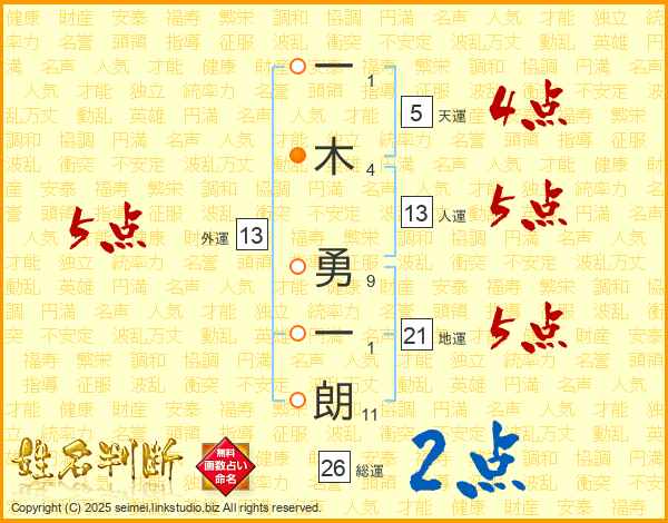 一(1画)木(4画) 勇(9画)一(1画)朗(11画)