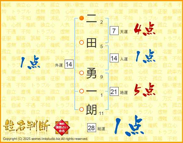 生活面を象徴する運勢です。外部から受ける影響力を表し、結婚運、家庭運や職場、環境への順応性を表します。総運から人運を引いた画数。姓や名が1文字の場合を除く。