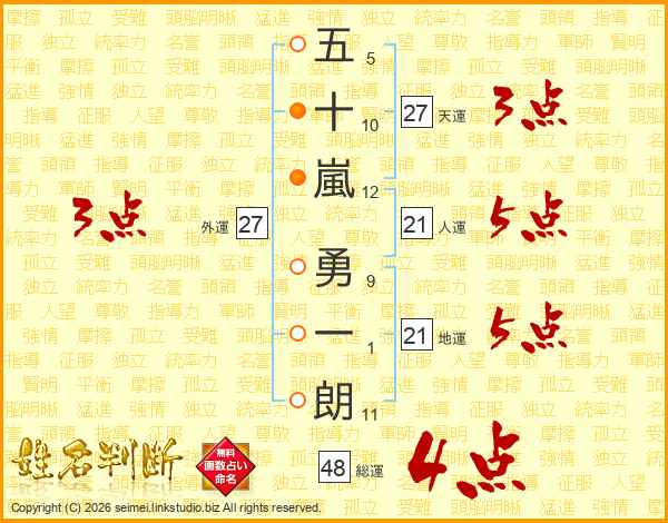 五(5画)十(10画)嵐(12画) 勇(9画)一(1画)朗(11画)