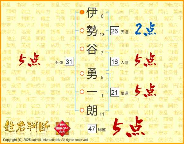 伊(6画)勢(13画)谷(7画) 勇(9画)一(1画)朗(11画)