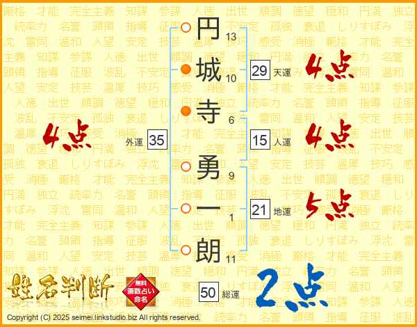 円(13画)城(10画)寺(6画) 勇(9画)一(1画)朗(11画)