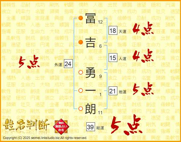 冨(12画)吉(6画) 勇(9画)一(1画)朗(11画)