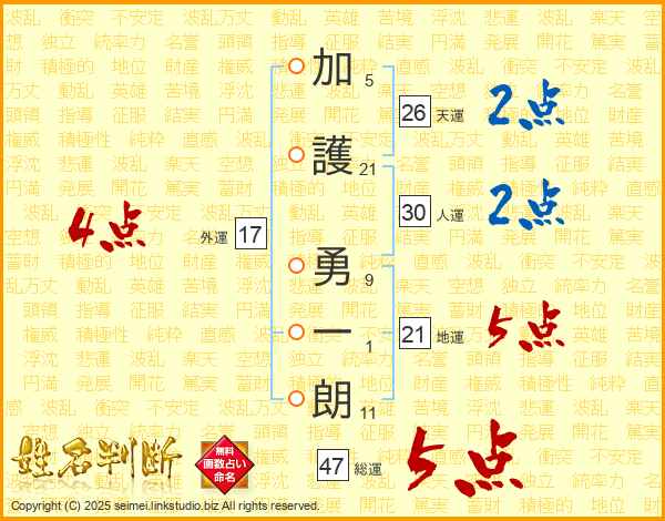 加(5画)護(21画) 勇(9画)一(1画)朗(11画)