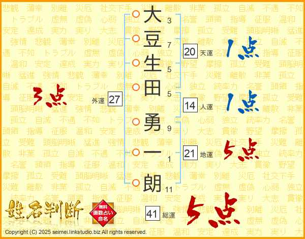 大豆生田勇一朗さんの総運は41画の5点!