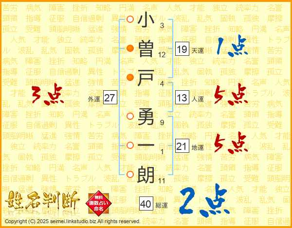 小(3画)曽(12画)戸(4画) 勇(9画)一(1画)朗(11画)