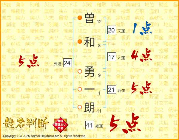 曽(12画)和(8画) 勇(9画)一(1画)朗(11画)
